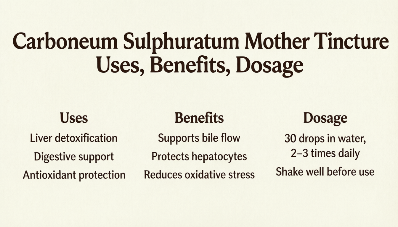 Carboneum Sulphuratum Mother Tincture is a deep-acting homeopathic remedy useful in chronic infections, skin disorders, blood toxicity, and low vitality states.